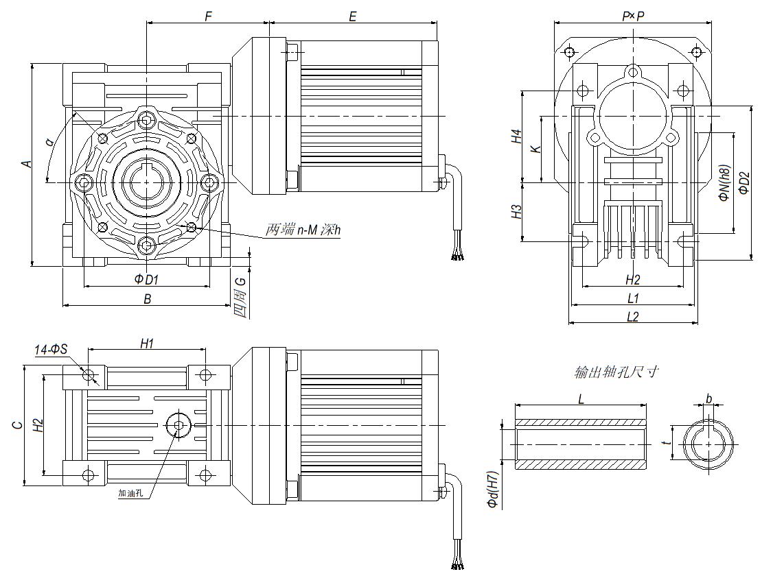 | 型號 | 減速箱代號 | A | B | C | D | D1 | D2 | E | F | G | H1 | H2 | H3 | H4 | |